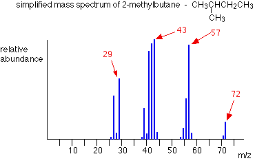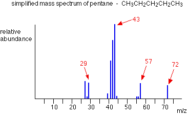 All sorts of fragmentations of the original molecular ion are possible – and that means that you will get a whole host of lines in the mass spectrum. For example, the mass spectrum of pentane looks like this: