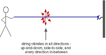Imagine tying a piece of thick string to a hook in a wall, and then shaking the string vigorously. The string will be vibrating in all possible directions – up-and-down, side-to-side, and all the directions in-between – giving it a really complex overall motion.