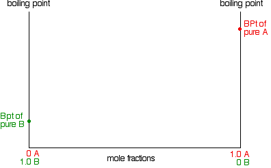 Secondly, the choice of which of these liquids is the more volatile is totally arbitrary. I could equally well have drawn a different diagram where A was the more volatile and had the higher vapour pressure. I could also have reversed the mole fraction scale with pure A on the left-hand side and pure B on the right. All of this, of course, will mean that these diagrams (and all those that follow) could look subtly different if you find them from different sources. It is really important with this to understand what is going on, otherwise you risk getting seriously confused.